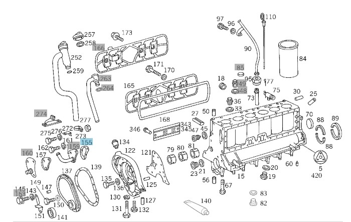 Pakking motor Unimog OM 352/353 nummer 155 op de tekening